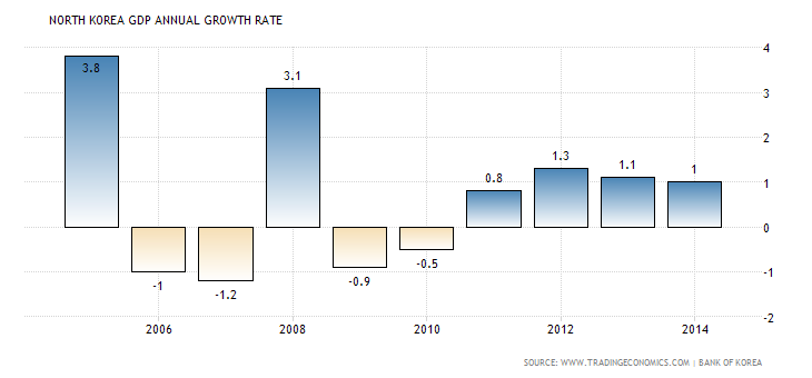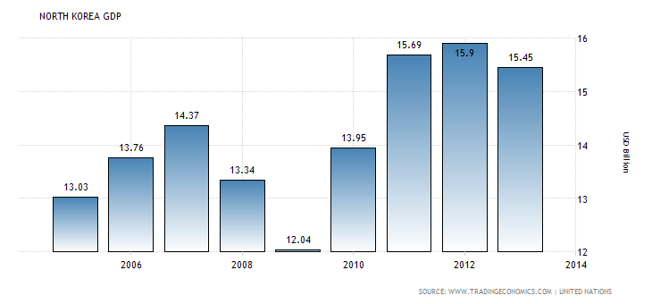 还有其他机构的统计数据可以佐证。根据联合国统计数字,2011年至2013年间,韩国国内生产总值(GDP)分别为朝鲜的76.6倍、76.9倍和84.5倍。而按照韩国央行的统计,2012年至2014年间,韩国的GDP增长率分别为2.3%、2.9%和3.3%,也高于朝鲜的1.3%、1.1%和1.0%。根据此前的报道,由于闭关锁国和遭受制裁,朝鲜每年以国家名义进行劳务输出的创汇所得可能就占到了GDP的8%到15%。
