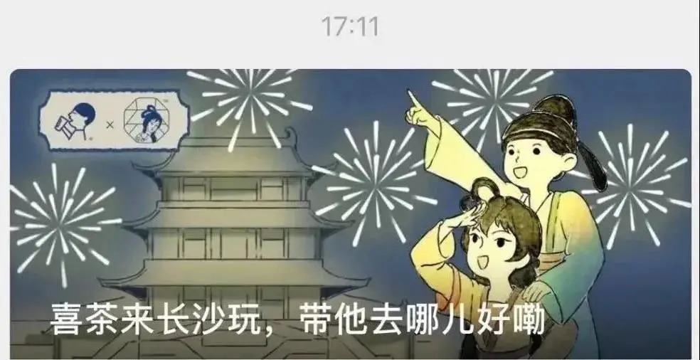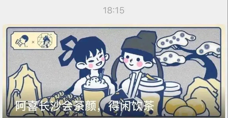 前段时间,茶颜悦色和喜茶进行了一场联名。先后在微信公众号发出消息,讲了喜茶到长沙和茶颜悦色“面基”的故事。茶颜悦色的角色延续logo上的古风女子形象,喜茶则打造成古代君子装扮,CP感十足。