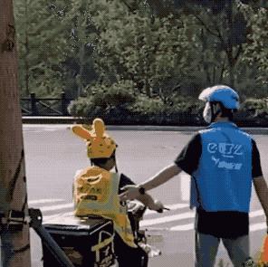 而后,饿了么也给外卖小哥们配上了竹蜻蜓头盔。而上图的CP则是网友看到快递小哥们互捏耳朵的有爱互动,自发创作的。