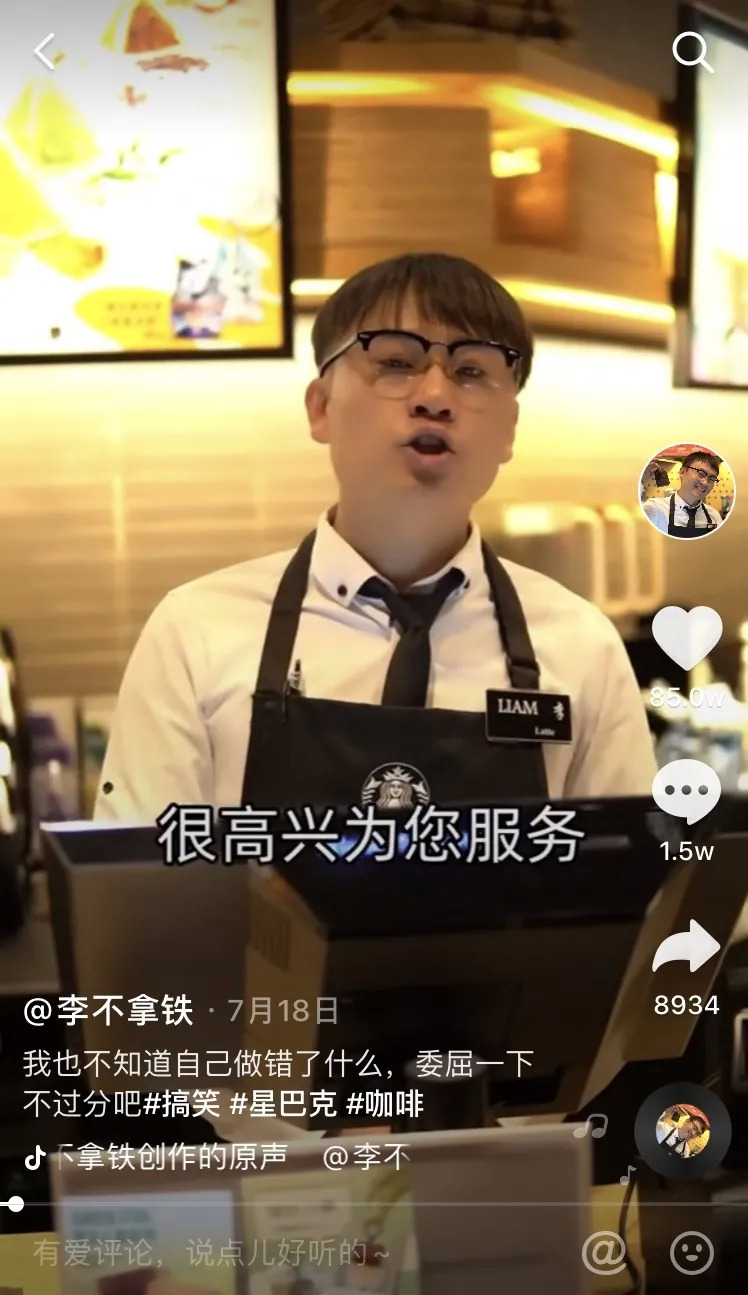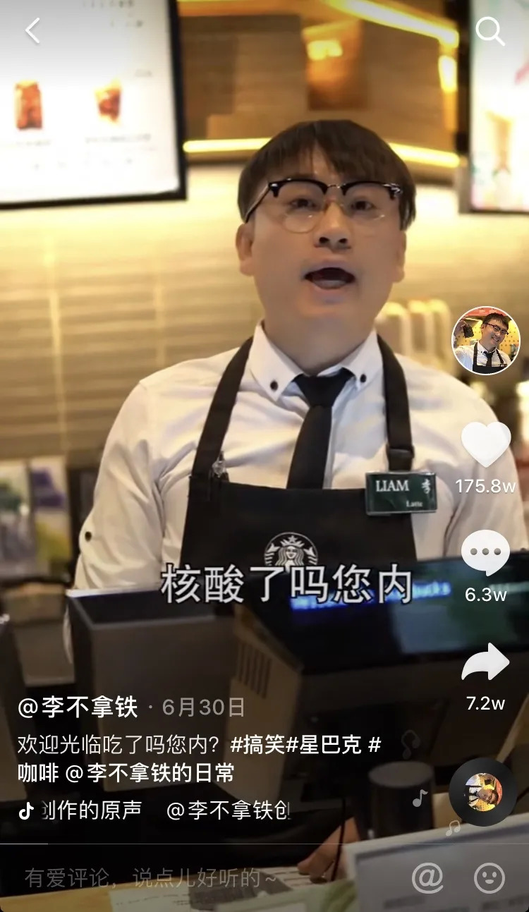 以一段7月初发布的视频来看,李不拿铁融入了当时流行于北京的打招呼用语”核酸了吗您内”,全程和一位老北京大爷抖机灵,甚得网友们喜爱,粉丝点评“国际范的星巴克硬生生给开成了北京老茶馆”。