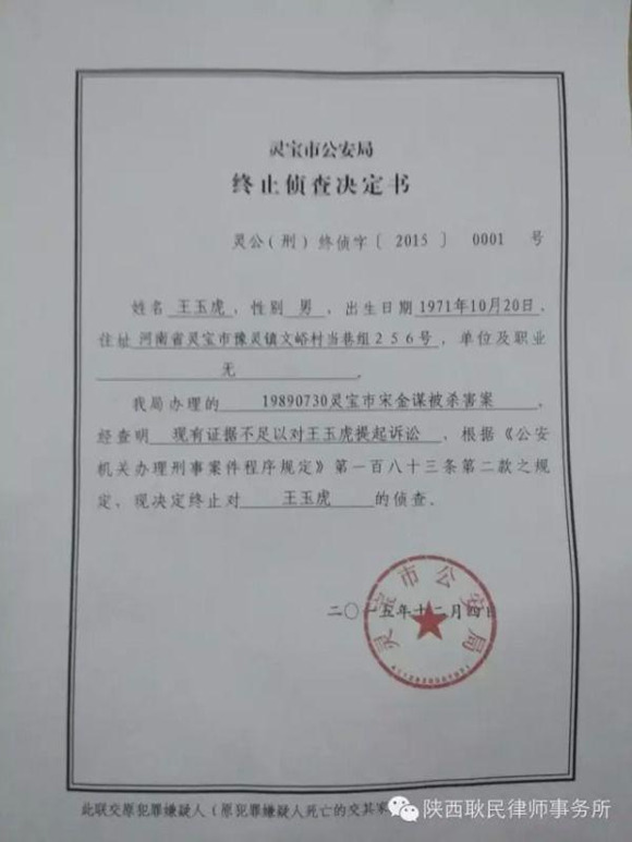 这份决定书显示,灵宝市公安局1989年办理的一件谋杀案,经查明现有证据不足以对王玉虎提起诉讼,根据《公安机关办理刑事案件程序规定》,现决定终止对王玉虎的侦查。