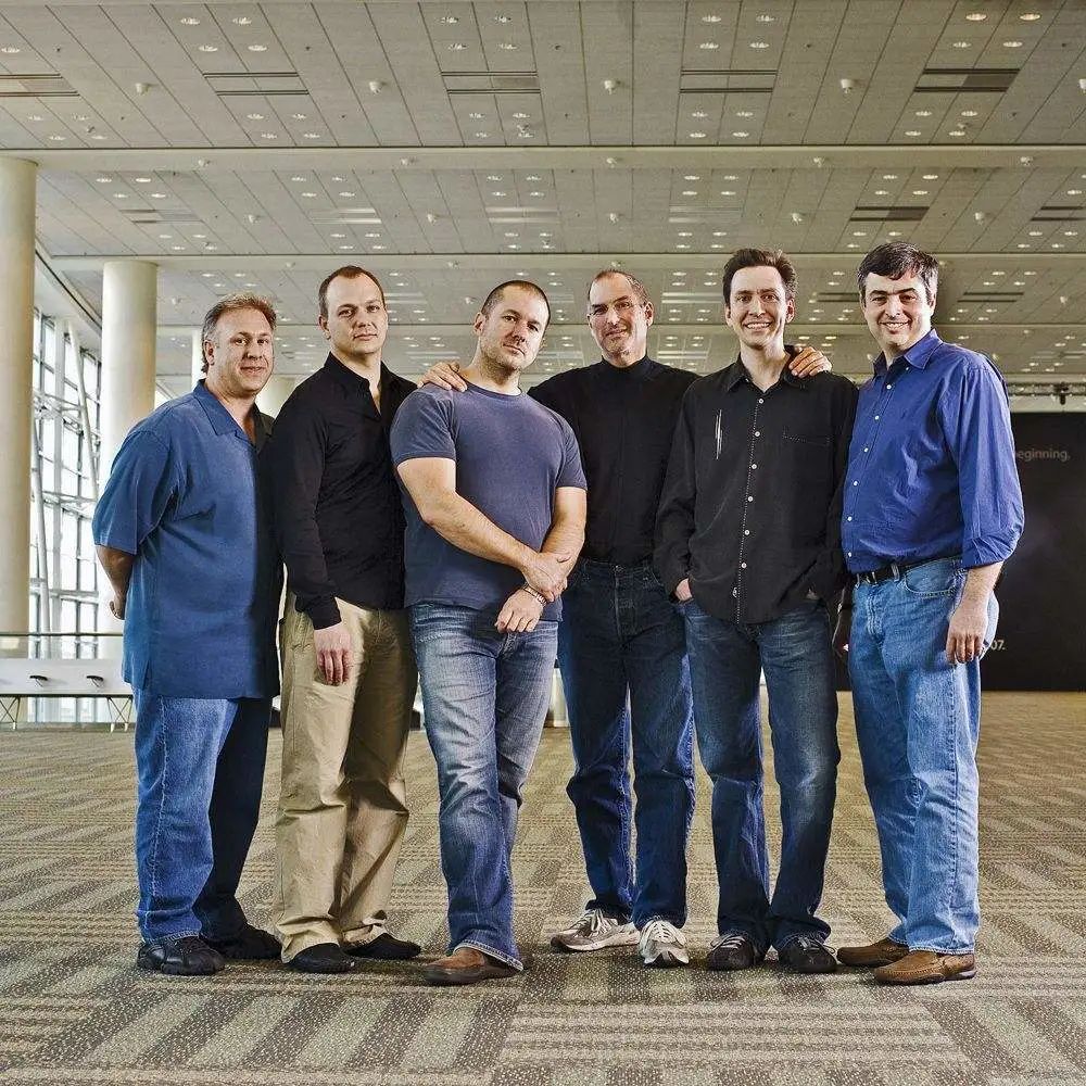 ▲苹果早期高管团队,从左至右:菲尔·席勒(Phil Schiller)、安东尼·法戴尔(Anthony Fadell)、乔纳森·伊夫(Jony Ive)、史蒂夫·乔布斯(Steve Jobs)、斯科特·福斯特尔(Scott Forstall)、埃迪·库(Eddy Cue)