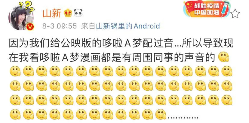 甚至连曾经参与《哆啦A梦》中文版制作的配音演员山新也不淡定了……