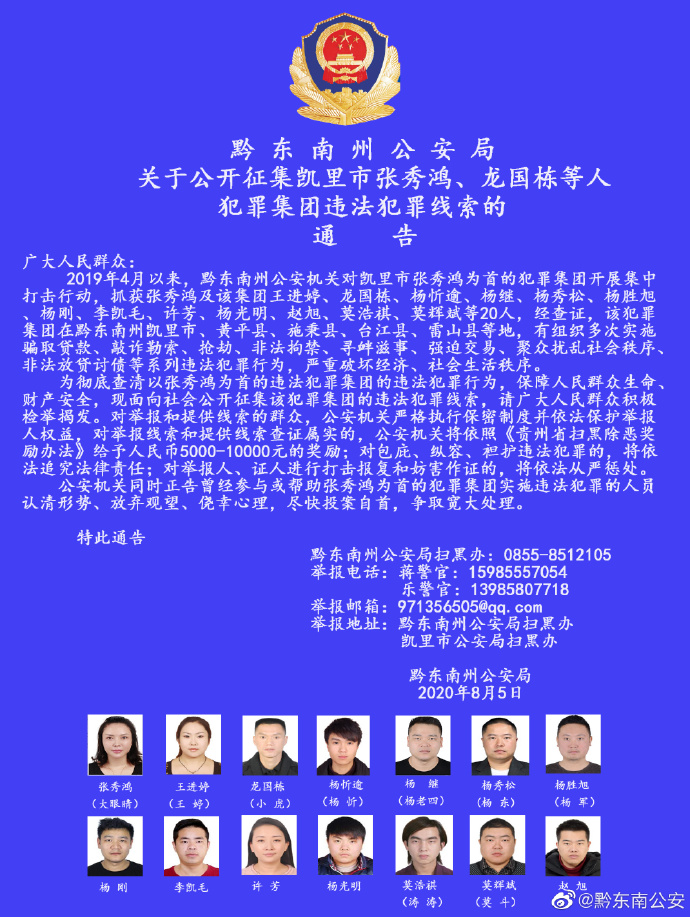 据贵州省黔东南州公安局微博消息,8月5日,黔东南州公安局发布《关于公开征集凯里市张秀鸿、龙国栋等人犯罪集团违法犯罪线索的通告》。