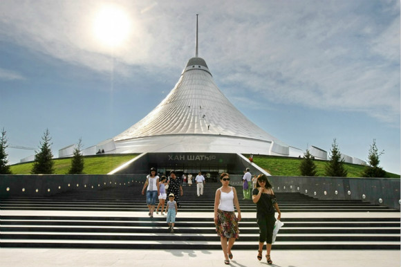 而这其中最显目的要数出自知名设计师诺曼·福斯特(Norman Foster)之手的可汗沙特尔购物中心( Khan Shatyr)。这座被称为“大帐篷”的建筑伫立在城市通往机场的大道上,整体面积达到了127000平方米,而高度算上塔尖足足能有150米。要建造这座庞然大物可谓是煞费苦心。这个地方的气候极端寒冷,建筑物的内部用材需要极具考究,只能依靠特殊的化学材料和先进的技术。而为了体现它的国际姿态,这个购物中心外面还建有人造沙滩,白沙是从马尔代夫专门运来的,并且需要维持一个35C的常温——名副其实的挥金如土!当然他们会说,哪个国外的购物中心没有沙滩呢?