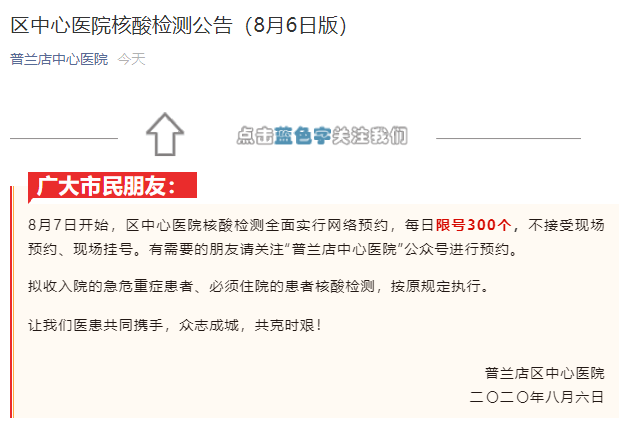 普兰店区中心医院8月6日消息,8月7日开始,区中心医院核酸检测全面实行网络预约,每日限号300个,不接受现场预约、现场挂号。有需要的朋友请关注“普兰店中心医院”公众号进行预约。