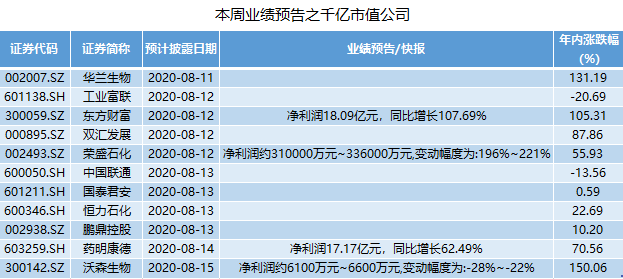 本周有11家市值超过千亿元的公司将披露中报业绩,分别是工业富联(601138.SH)、药明康德(603259.SH)、东方财富(300059.SZ)、双汇发展(000895.SZ)、中国联通(600050.SH)、国泰君安(601211.SH)、恒力石化(600346.SH)、沃森生物(300142.SZ)、荣盛石化(002493.SZ)、鹏鼎控股(002938.SZ)、华兰生物(002007.SZ)。