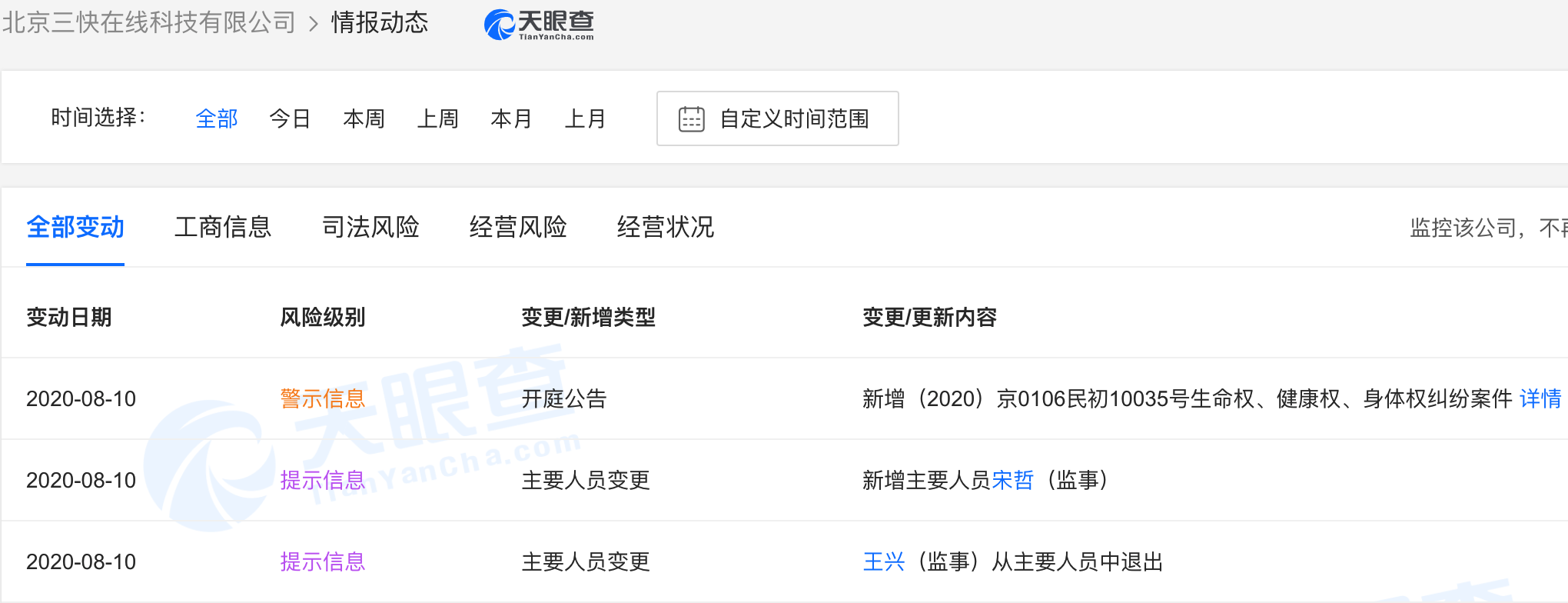 天眼查数据显示,8月10日,美团关联公司北京三快在线科技有限公司发生工商变更,王兴退出监事,由宋哲接任。美团有限公司持有该公司100%的股份。此前王兴卸任三快云在线(北京)科技有限公司监事一职。