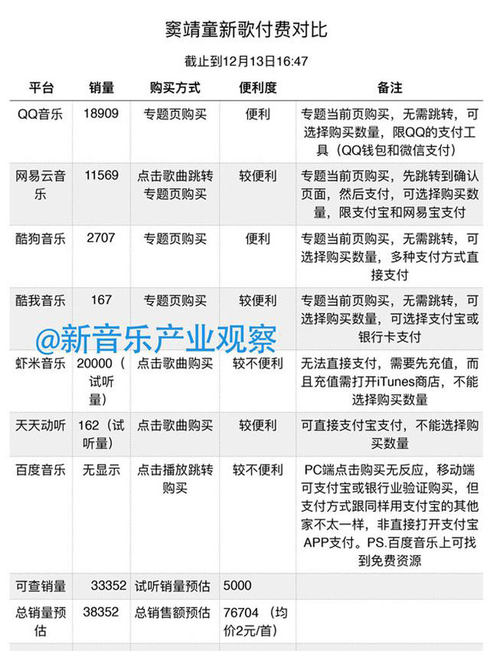 虾米和天天的数据取自前台显示的试听量,考虑到存在单次销售多次试听的可能,所以只能算预估值。