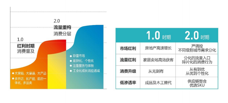 房地产市场的政策调控导致市场红利消退,过去依靠卖场的传统渠道也将受到抑制。在这种背景下,存量市场将替代增量市场成为主战场,流量结构被重构,体现在消费行为的碎片化、流量入口的多样化、消费场景的多元化。