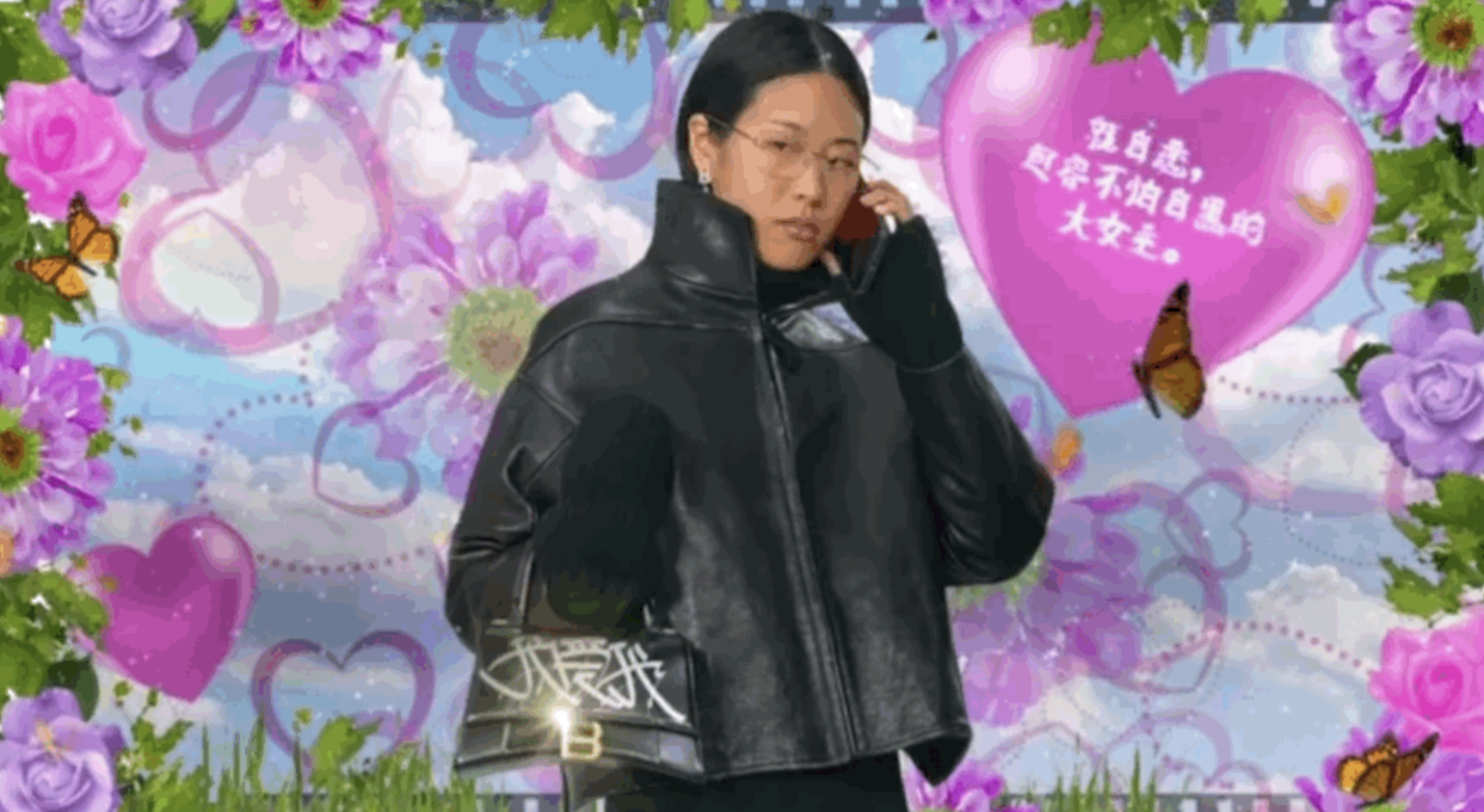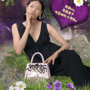 在8月10日晚间披露的七夕限定中,Balenciaga以涂鸦形式在Hourglass包袋上绘上“我爱你”、“你爱我”和“我爱我”的字样,并为之制作了广告大片。在广告中,Balenciaga选用流行于2000年代头十年的大头贴元素进行拍摄——两位模特在山水幕布前摆出恩爱姿态。