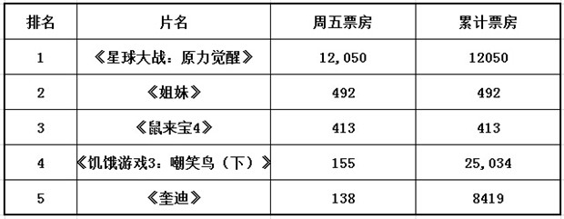 其他影片方面,与《星球大战:原力觉醒》同日上映、由蒂娜·菲和艾米·波勒联袂主演的喜剧 电影《姐妹》和《鼠来宝4》分别紧随其后,《姐妹》周五票房收入490万美元位居亚军,本周末有望实现1400万美元的首周末票房。《鼠来宝4》周五票房410万美元,预计将首周末将收获1450万美元左右的周末,在《星球大战:原力觉醒》和《鼠来宝4》之间,更多的大人不得不带着小孩去看《鼠来宝4》,因此本周末的票房,《星球大战:原力觉醒》在经历了首波的星战资深粉丝狂热支持之后,将迎来真正的票房与口碑的双重考验。