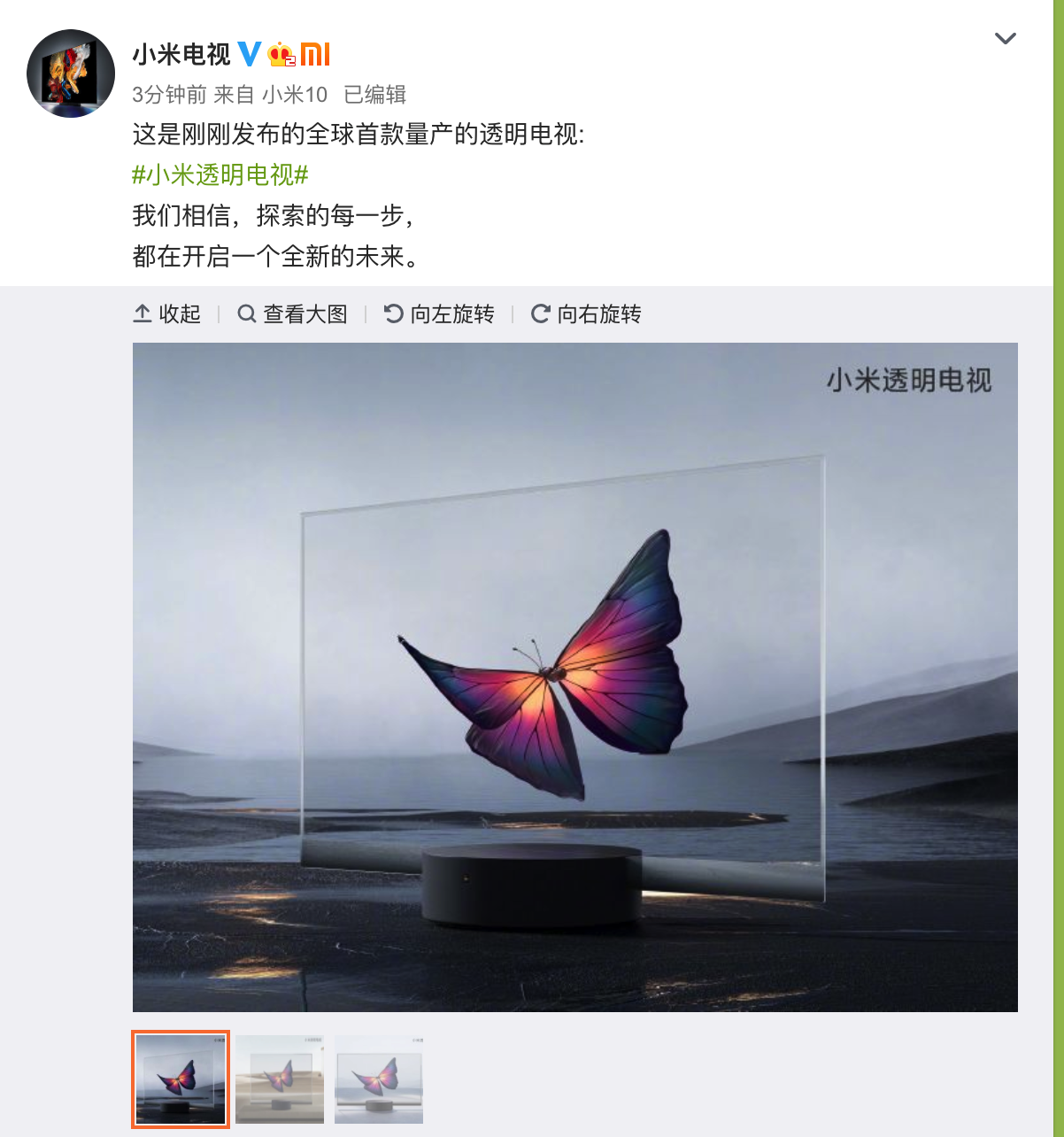 小米电视官方微博11日晚间消息,小米发布全球首款量产透明电视,使用透明OLED屏幕,售价49999元。