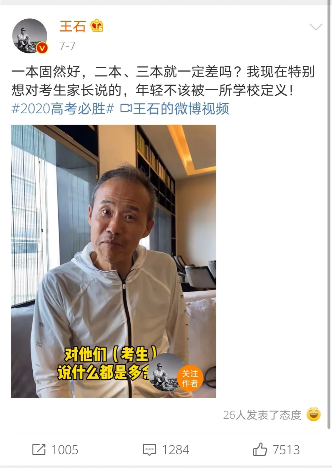 今年高考前夕,万科集团创始人王石发博称,一本固然好,二本、三本就一定差吗?年轻不该被一所学校定义。