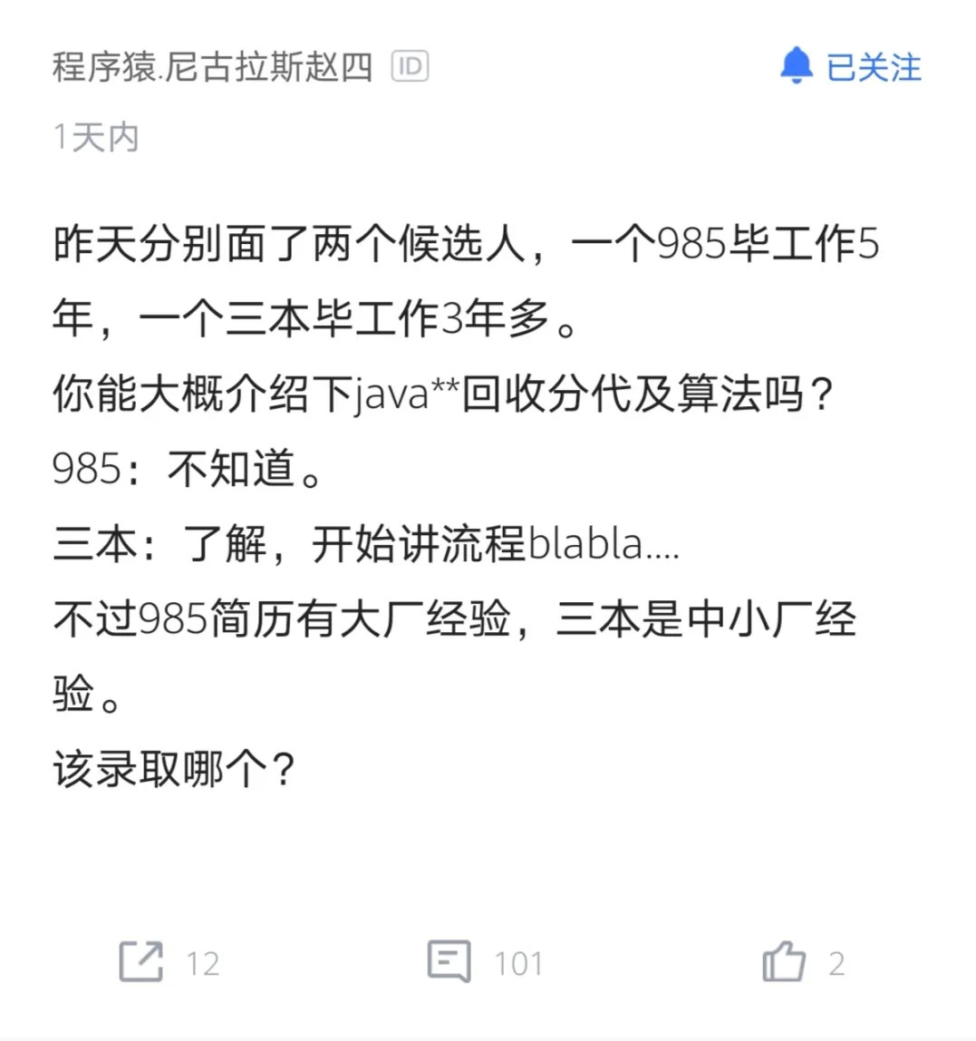 不难看出,在收到两个候选人的简历时,HR内心更偏向于985毕业的候选人,但是通过面试之后,她的想法动摇了,似乎985生的能力并不是很出众。于是她发帖向网友求助。