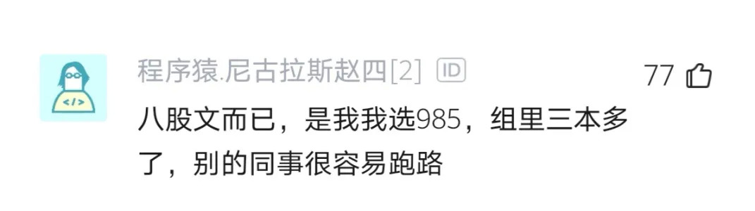 其中,热评第一网友称“八股文而已,是我我选985,组里三本多了,别的同事很容易跑路”