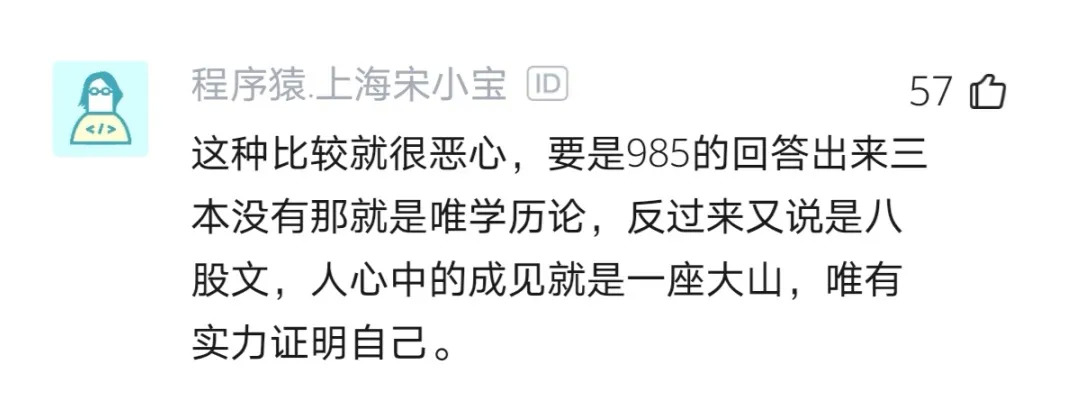 有网友反驳了“八股文”说法,称如果985生面试表现比三本生好,那就是唯学历论;985生面试表现没有三本生好,那就是“八股文”论,归根到底是人心中的“学历至上论”在作祟。
