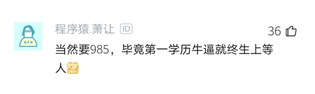 有网友表示,当然要985,第一学历牛逼终生都是上等人,不过他加的这个表情,耐人寻味。