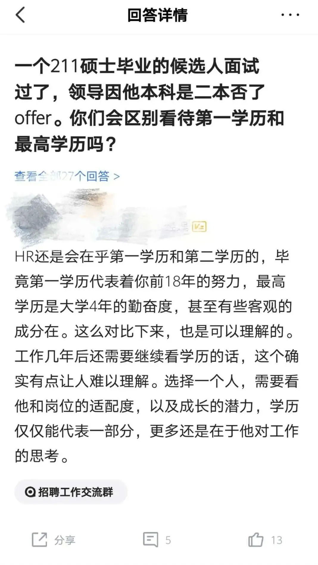 这位网友因为学历完全否定了三本毕业生,他的考虑有两方面原因:一、面试时的优秀表现可能只是临时准备的“话术”,未必代表真正的实力;二、一家公司如果有很多三本毕业生,会引起其他同事的不满。