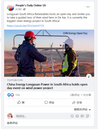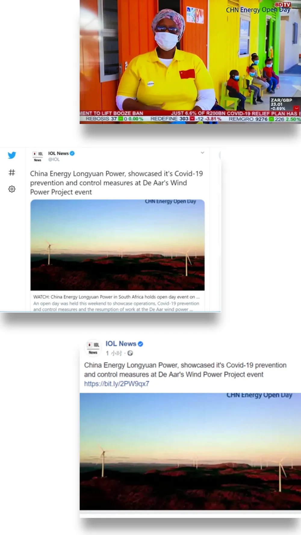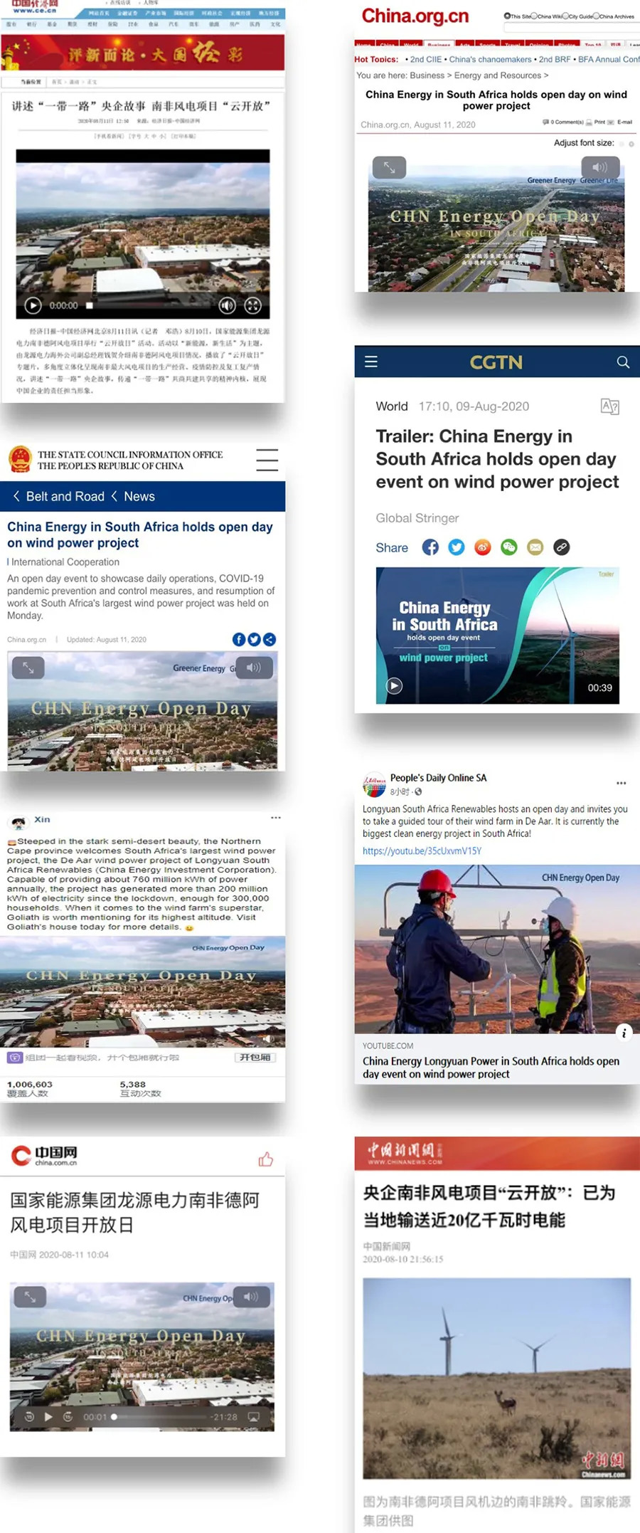 同时,德阿风电项目的“云开放日”活动还受到了海外媒体,尤其是南非媒体的广泛报道。南非主流媒体独立传媒、时代传媒的网站页面和报纸重点宣传,南非经济类电视节目DSTV412频道播放了专题片。国际媒体South Africa Horizon、PR Newswire UK、One News Page Global Edition等媒体发布报道22篇。