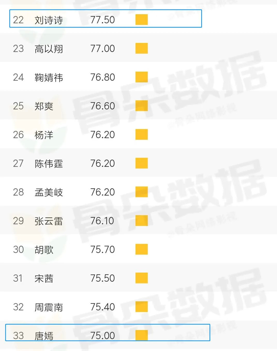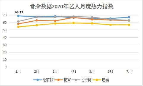 由于赵丽颖、杨幂、刘诗诗、唐嫣四位艺人在上半年均无新播剧,非常少见地在霸屏榜“查无此名”,并直接影响到其各自的热力指数。数据显示,过去七个月,四人相比,赵丽颖热力指数最为稳定,五次位列第一;杨幂、刘诗诗交替位列二、三名;唐嫣由于怀孕生子,较少出现在公众面前,热力值最低。