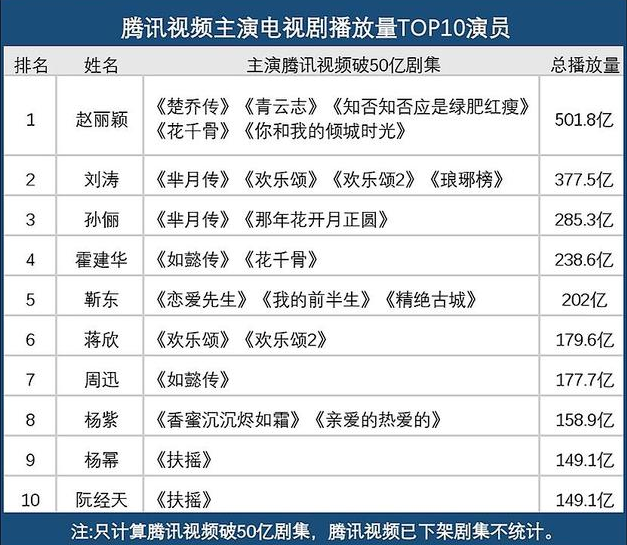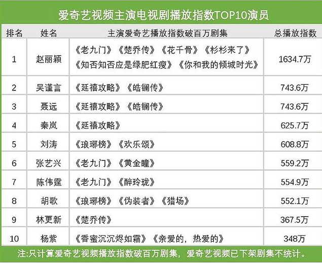 综合多平台电视剧播放数据来看,赵丽颖表现最为亮眼。数据显示,截至今年三月,主演爱奇艺播放指数破百万剧集中,赵丽颖的《老九门》《楚乔传》《花千骨》《知否知否应该绿肥红瘦》《杉杉来了》《你和我的倾城时光》均在榜,总播放量达1634.7万,断层第一。主演腾讯视频破50亿剧集中,凭借五部作品,总播放量超五百亿,依旧稳居第一。