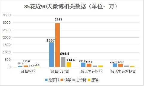 综合近90天以来四人的微博指数、微博新增粉丝、互动量,超话累计粉丝量、发帖数,杨幂与赵丽颖粉丝忠诚度相近,杨幂粉丝活跃度较高。刘诗诗和唐嫣粉丝活跃度均不高,超话排名多处于100名以外。