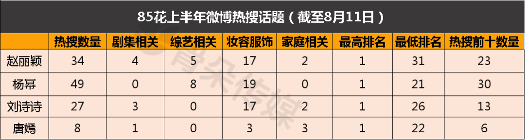 杨幂是当之无愧的热门话题收割机。根据统计,2020年1月1日至8月11日期间,杨幂累计微博热搜50个,妆发服饰相关19个;赵丽颖相关微博热搜34个,妆发服饰相关达17个;刘诗诗累计微博热搜27个,妆发服饰相关17个;唐嫣累计微博热搜8个,妆发服饰3个。