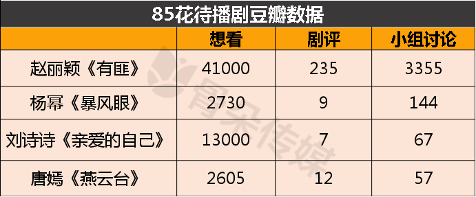 前有姐圈、姨圈乘风破浪,后有新生代小花迎头赶上,四位85花旦在后半年能否延续其剧中大女主的风姿和魄力,还有待观望。