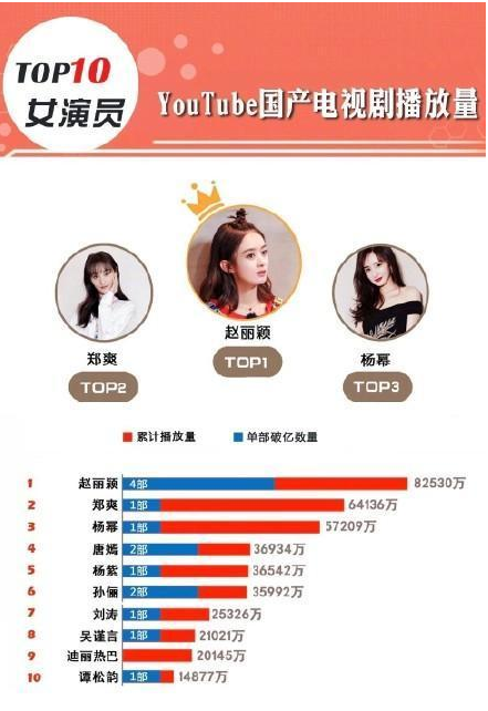 受疫情影响,受众对优质剧集需求量增大,导致上半年影视剧播放量总体上扬。因此,四位艺人虽无新剧上线,但老剧都表现不俗,呈现出常温常新的态势。七月公布的Youtube国产剧播放量榜单显示,赵丽颖、杨幂、唐嫣均进入高位。