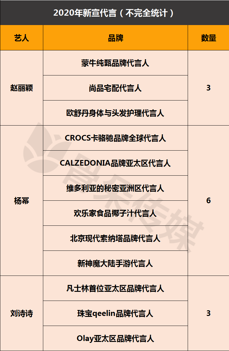 相对而言,开年以来,以往或同步霸屏或接棒霸屏的85花旦,赵丽颖、杨幂、刘诗诗、唐嫣四人成绩都不算突出,上半年均无新播剧,参与的综艺热度一般,艺人在综艺中的表现也引发了不少争议,个人热度较往年同期均有下降。但另一方面,四人在代言、时尚资源方面依然独占鳌头,带货能力依然抢眼。