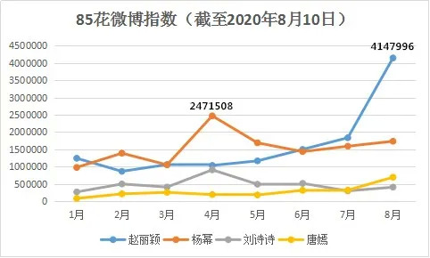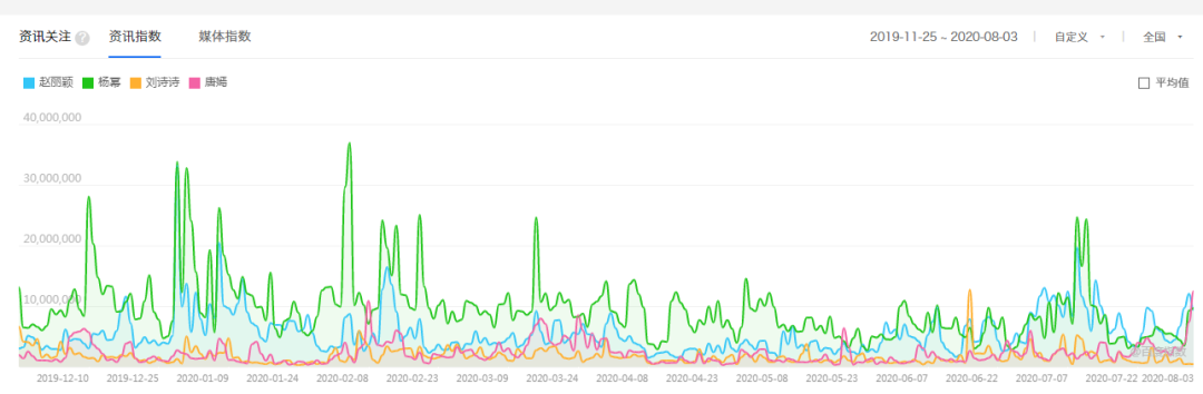对比2020年开年至今四人的百度指数,杨幂整体数据指数最高,赵丽颖近期迎头赶上。前者在商务、时尚方面风头无二,辅之以综艺持续输出话题,后者有多部优质剧集傍身,并同样搭配综艺保持曝光,最终呈现不分伯仲的态势。闭关拍戏的刘诗诗与刚刚复出的唐嫣稍显逊色,两人均选择通过宣传营销新作以及家庭生活,继续收割国民度。