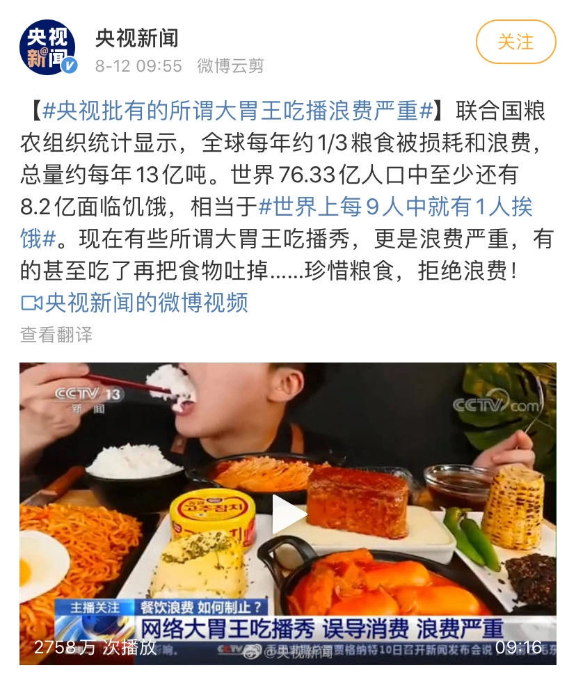 8月12日,央视在一档新闻节目中批评了部分“大胃王吃播”误导消费、浪费严重的现象,引起广泛讨论。随后,抖音、快手、微博等平台相继做出回应,表示会对目前吃播中含有浪费粮食,或假吃、催吐、宣扬量大多吃等博眼球行为的内容进行严肃处理。
