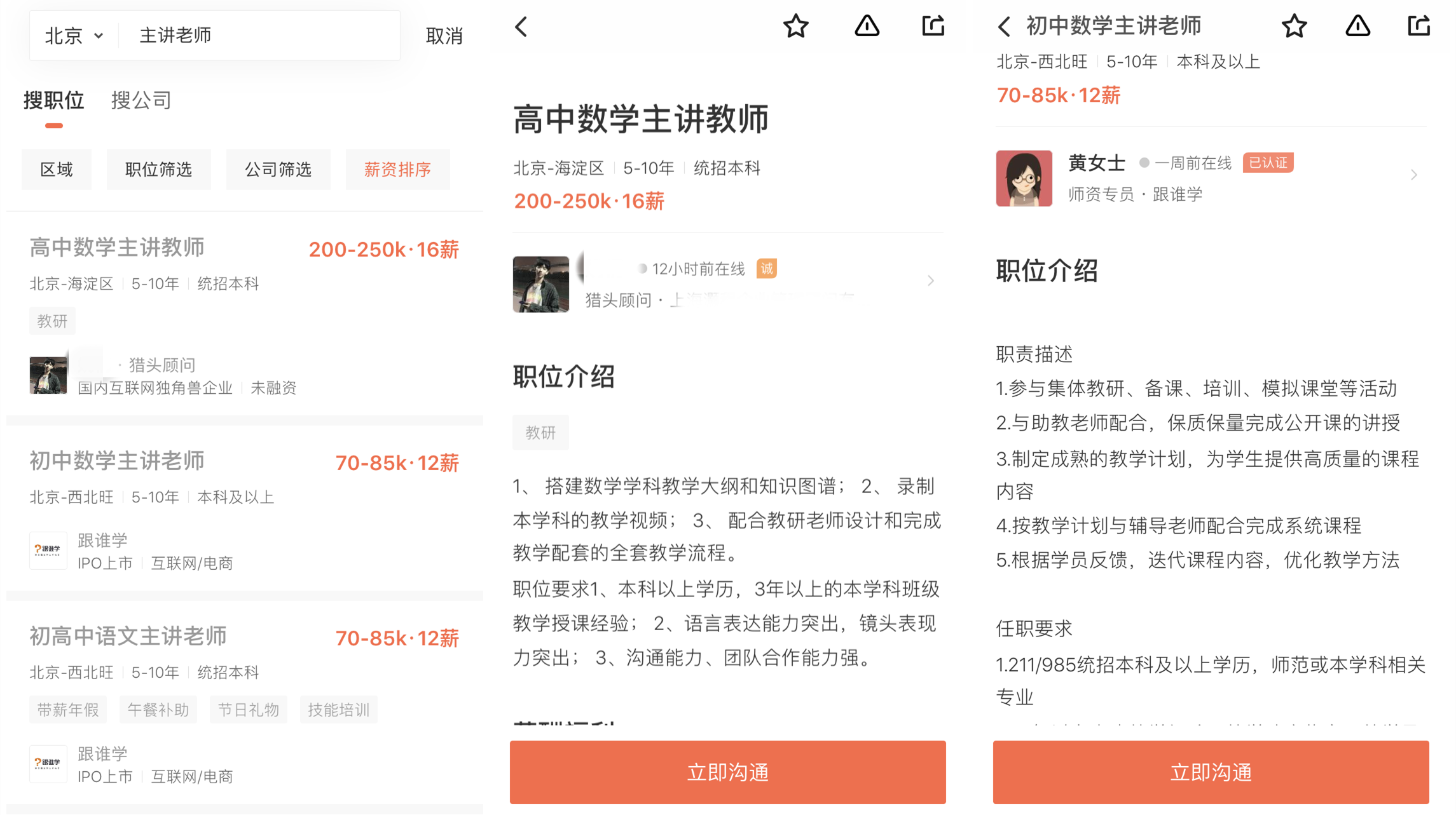 以北京地区为例,按薪资排序搜索后,字节跳动“高中数学主讲教师”岗位薪资最高,年薪范围在320万至400万元之间。跟谁学“初中数学主讲老师”岗位薪资位列其后,年薪在84万至102万元之间。