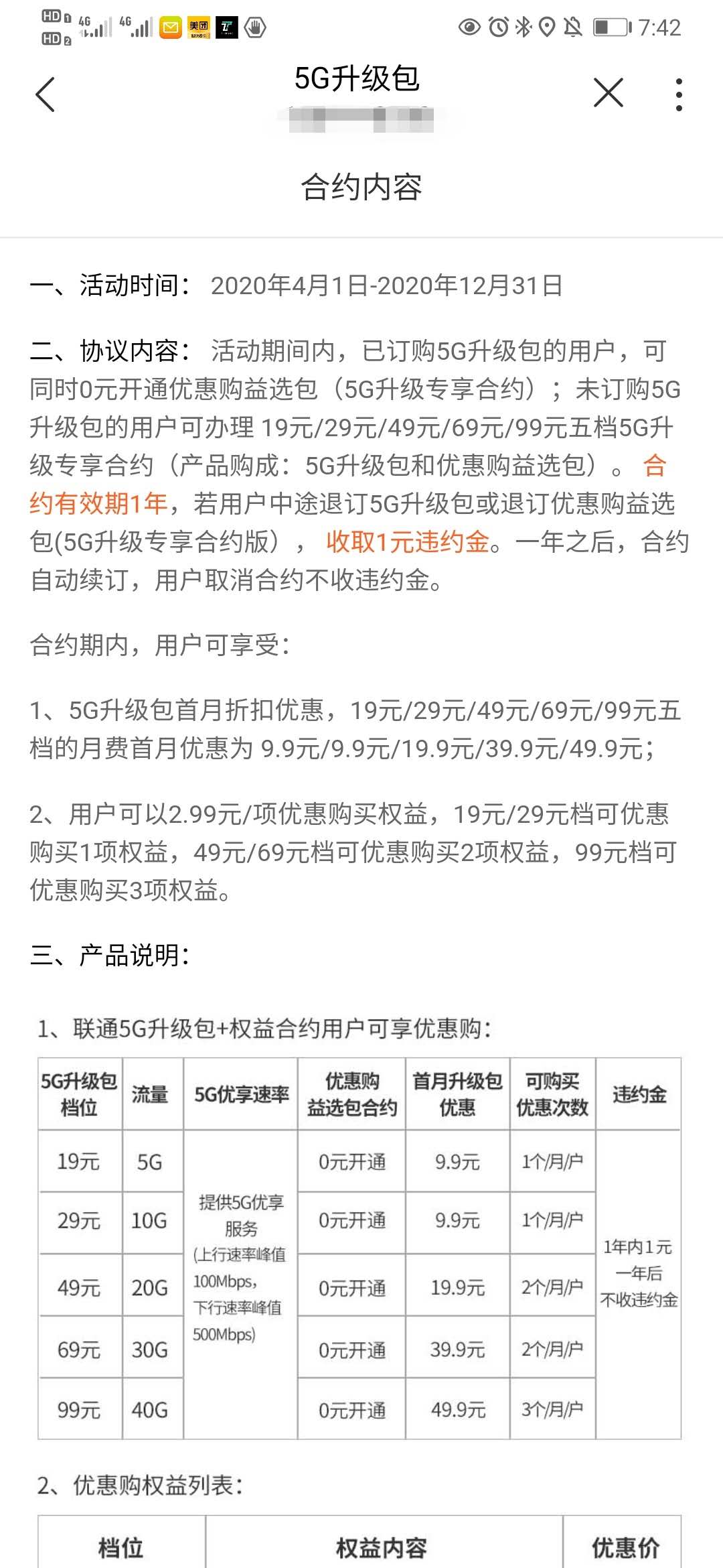 这也就是说,消费者在订购5G升级包时实际相当于自动和联通签订了一个12个月的协议合约,而这个协议合约一旦生效后,退订就需要去线下才能解除,且需要交纳违约金。但据尤先生介绍此前联通客服再给他推销升级包时,从未提起过合约的有关事项。