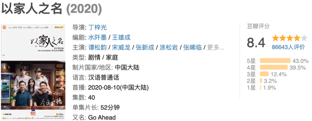 摒弃婆媳矛盾、社会现实等强矛盾冲突主线,《以家人之名》在原生家庭问题外衣下,聚焦在日常琐碎的生活关系,看似弱化剧情,却让观众感动于真实生活细节之中,另外随着谭松韵、宋威龙、张新成等青年偶像演员的加持,整部剧集深受年轻观众喜爱。