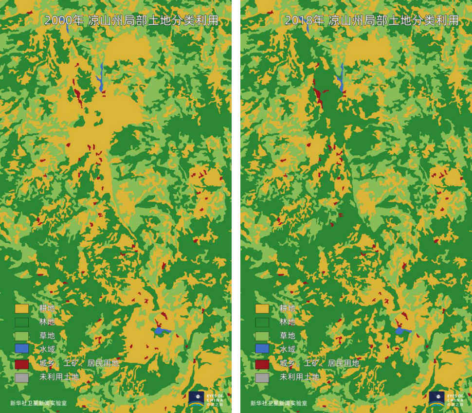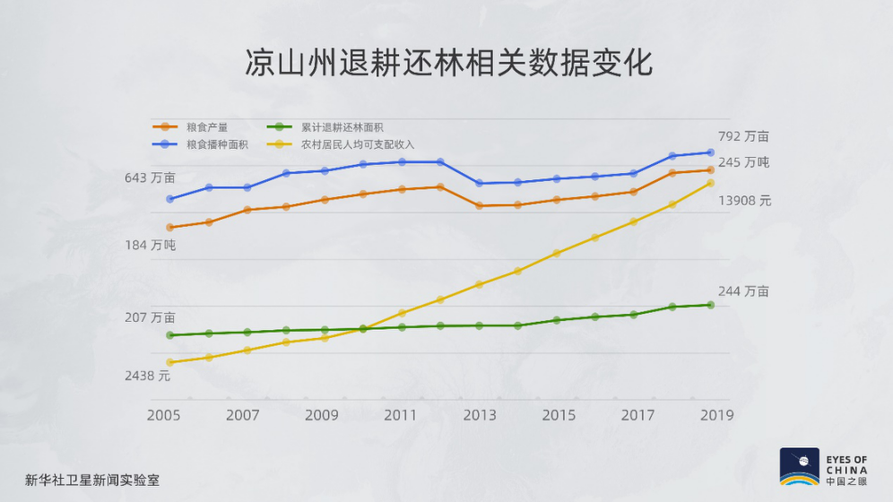 累计退耕还林超过243.8万亩,卫星观察到凉山植被的变化,反映出水土流失被控制、减缓以及扭转的全过程,粮食年产量实现高达50%的增长。