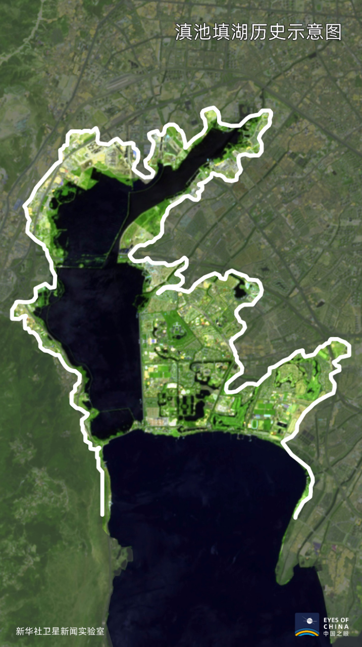 ↑滇池北部填湖示意图,白线内土地为上世纪60年代后填湖所得。