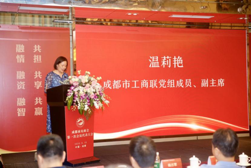成都市工商联党组成员、副主席温莉艳发表重要讲话。她表示,商会是一个凝聚人气、整合资源、促进相互发展的商务平台。近年来,南充、成都两地资本资源、社会资源、智力资源、产业资源密切联系、深度融合,在蓉南充籍企业