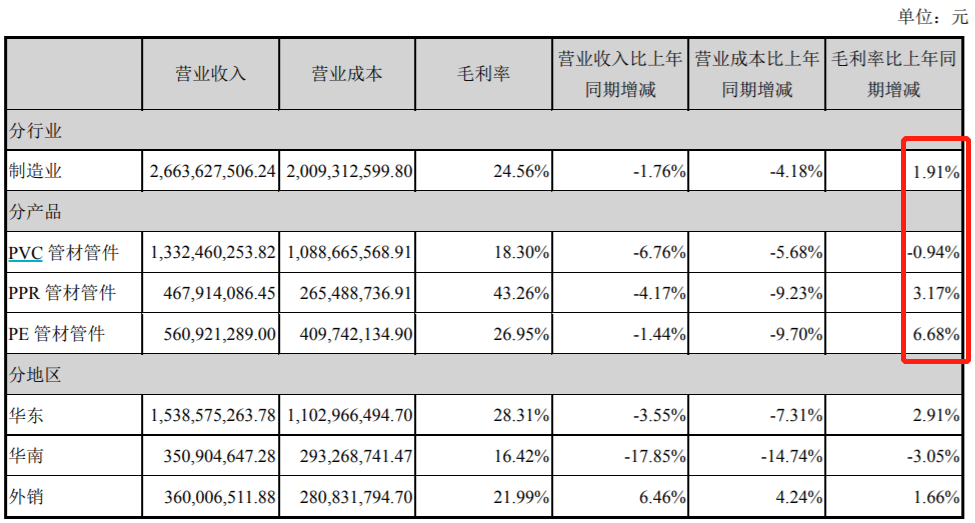 下图是永高股份的明细表,可以看到,分产品来看,主要产品营业收入均略有下滑,但是PPR、PE的毛利率提升较大,带来了整体毛利率提高了1.91个百分点。