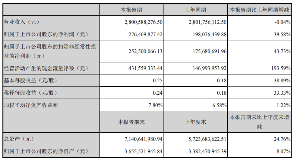 下图是永高股份的橄榄,可以看到上半年实现营业收入28亿,同比不增不减。实现扣非归母净利润2.53亿元,同比增长44%。这里营业收入和归母净利润增速差异大,我们后续要找原因:是毛利率大幅提高了,还是期间费用率大幅下降了,又或者两者都有。再看经营现金流净额4.32亿元,同比增长194%,这个指标就很好看了。
