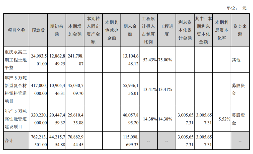 公司并没有在管理层分析里披露项目的进度,公司只是表示:“目前,公司年生产能力在60万吨以上,塑管产销规模在国内可比上市公司中位列第二,是目前国内A股上市的规模最大的塑料管道企业。”“加快完善生产基地建设和产能释放,加大市场拓展力度,降低运营成本,进一步提高市场竞争力。”