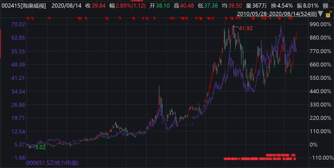 海康威视于2010年上市,我们将其上市后的股价走势与格力电器叠加,发现基本走势极其相似。