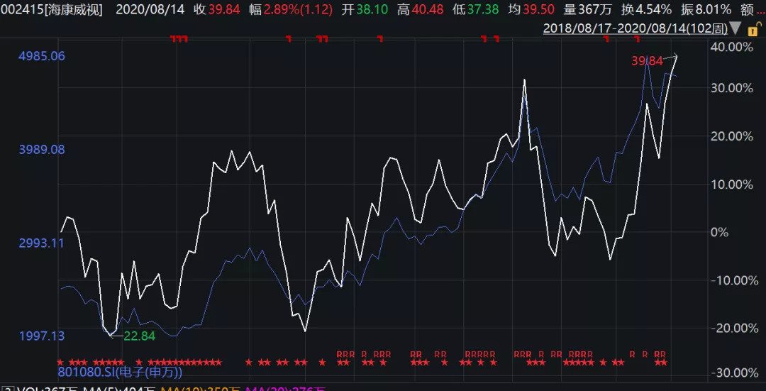 此外,我们要是把海康威视近3年的股价表现,放置于整个电子行业,可以看到其是与整个行业基本同涨同跌的,基本没有显示出阿尔法属性。这与市场近几年讨论的强者恒强、优势向龙头集中似乎背道而驰。