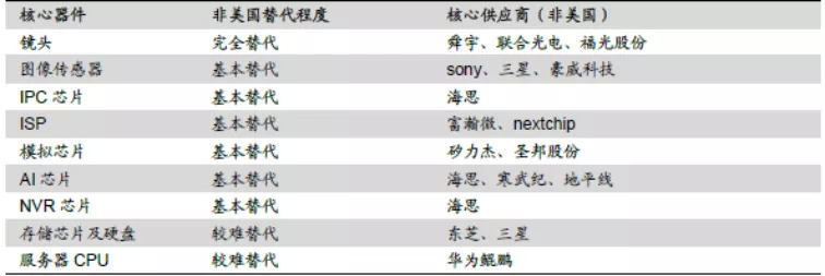 ▲图5:安防核心零部件非美国供应商梳理资料来源:集微网、华为、国信证券