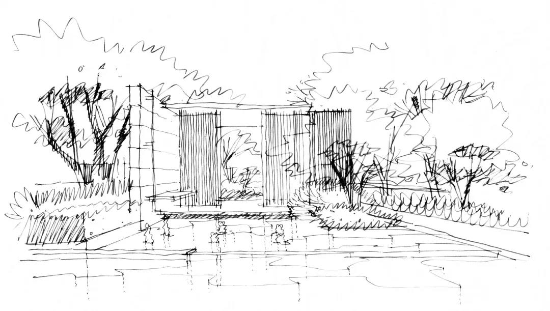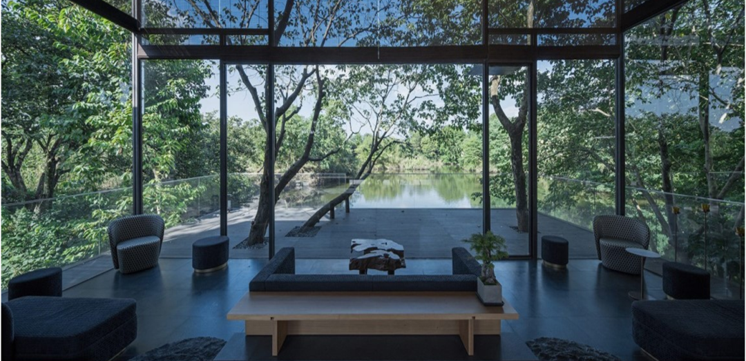 在冥想小苑,江南园林的叠石理水演变为现代景观水苑,而不同于传统江南园林的师法自然,在这里自然的无序与现代景观的序列恰当融合,自然置石的点缀与宁波本土文化元素的植入,细腻感恰到好处,宛如一座小巧精致的江南园林。