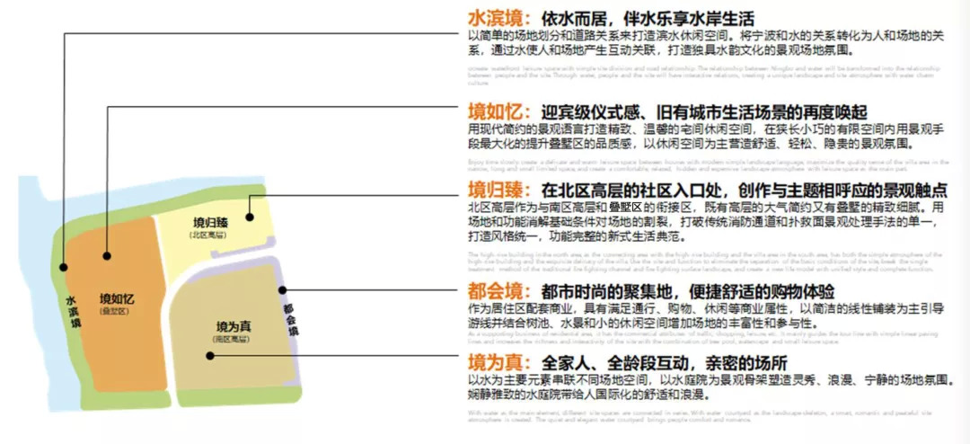 作为一个典型的江南水乡,宁波骨子里的闲适温润奠定了中海·新芝源境的园林基调,JTL团队在设计语言、风格的统一之下,调合现代都市的繁华,融宁波文化于自然,挖掘和重塑不同地块独有的性格特征,以景观的手法进行书写和表达,境归臻、境为真、境如忆、水滨境、都会境五大园林组团,呈现现代都市度假生活之悠闲与自然。