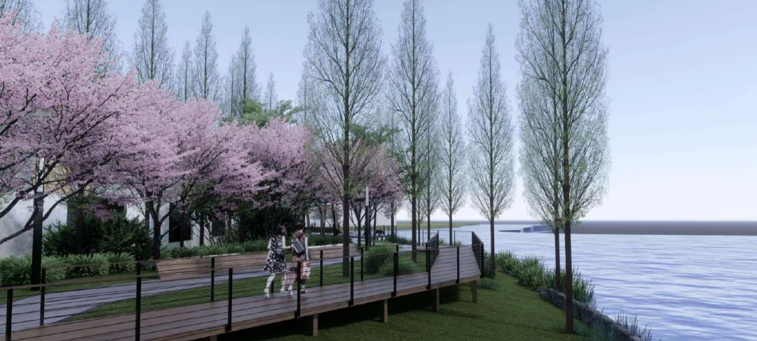 为一线水岸增加休闲栈道,开阔的水面与自然林间相映成趣,闲暇时光漫步、呼吸鲜氧。