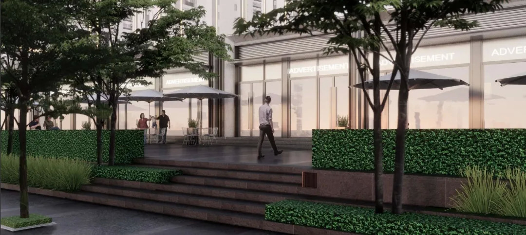 作为配套商街,以简洁的线性铺装为主引导游线,树池、小景、休闲空间,满足通行、时尚、休闲,营造公园式的时尚购物体验。