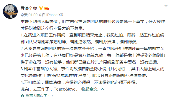 8月20日凌晨,《隐秘的角落》导演辛爽在微博发文回应“编剧起诉隐秘的角落出品方侵权”一事,否认关于侵权的说法。辛爽的回应中称在项目期间,与其一同工作的编剧团队只有剧本策划胡坤、编剧潘依然、编剧孙浩洋,编剧陈骥,均已署名。剧本基础人物及事件全部来自紫金陈小说《坏小孩》,其中人物上最大的变化是原作"丁浩"替换成现在的"严良",此部分思路由编剧孙浩洋提供。辛爽称“不打嘴架,应得的必须得,不该得的也必须不能得”。